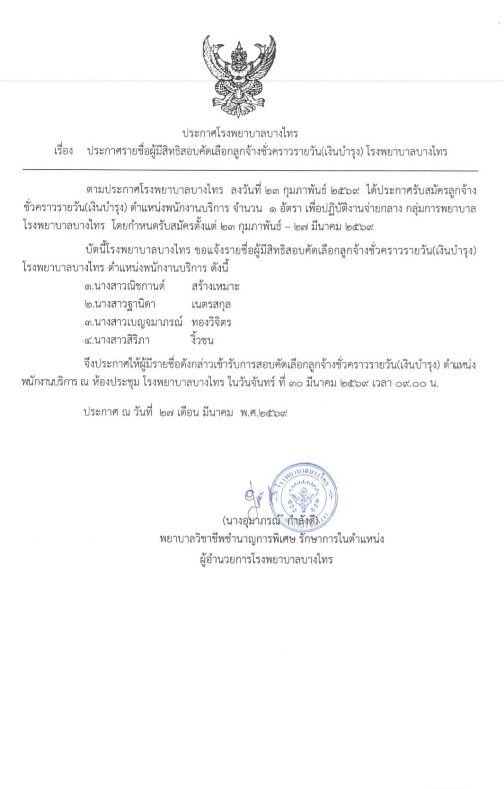 ประกาศรับสมัครลูกจ้างชั่วคราวรายวัน(เงินบำรุง) ตำแหน่งพนักงานบริการ
